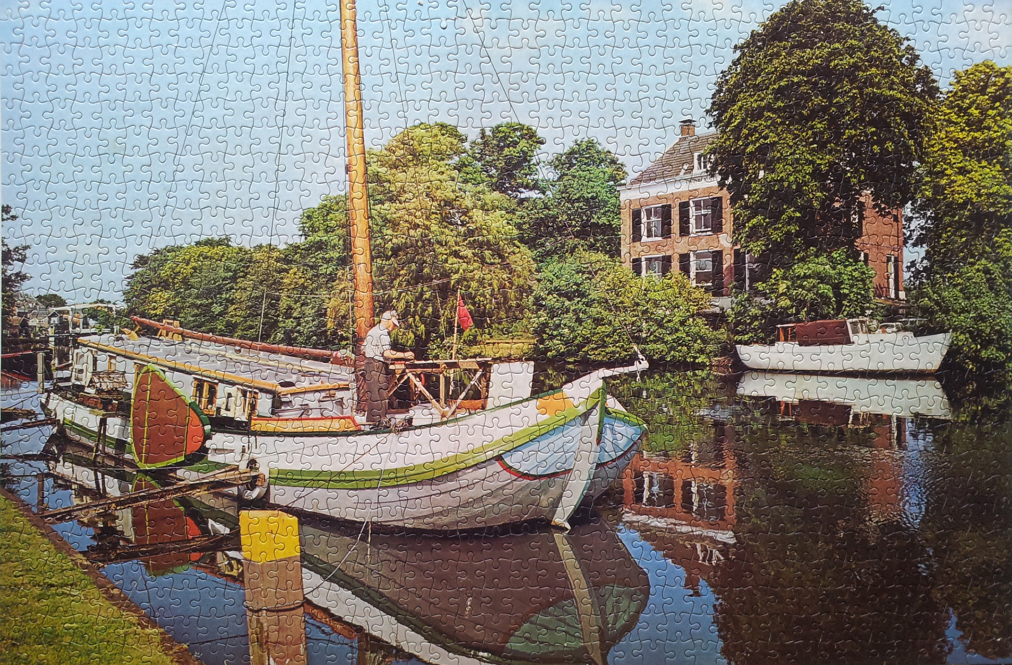 Eerst maar eens wat dingetjes uitzoeken. De puzzel was van het merk King, en na wat speurwerk op internet bleek dat dit Nederlandse merk tot circa 1980 zelfstandig was, maar toen werd ingeslikt door een grote concurrent, Ravensberger of Jumbo. Het plaatje zelf kon ik wel dromen. Net buiten het dorp ligt een jaagpad langs de Vecht, richting Nieuwersluis. Het eerste stuk tot de brug in de weg naar Loosdrecht is lekker breed, en tijdens de zomermaanden ligt het daar altijd vol met bootjes. Voor 1980 had de gemeente Loenen het waterverkeer als melkkoe nog niet echt ontdekt, dus lag daar vele jaren tijdens het warme seizoen een prachtige woontjalk, met de naam ''Overal Thuis''. Dat het schip daar niet voor een paar dagen lag, kon je wel zien aan de houten uithouders die de schipper aanbracht. Aan de overkant van de Vecht zie je de buitenplaats Vegtlust, een groot huis uit de achttiende eeuw, in 1981 verbouwd tot appartementencomplex voor de beter-gesitueerden. Overigens heeft in de jaren zestig in ditzelfde pand de importeur gezeten van Erika schrijfmachines. Die dingen werden in de DDR gemaakt, hadden een schreefloos lettertje en ondanks dat ze als slecht bekend stonden (W.F. Hermans heeft er nog over gemopperd) heb ik zo'n ding gedurende mijn hele studietijd gebruikt. Met hele lappen Type-out, dat spreekt vanzelf.