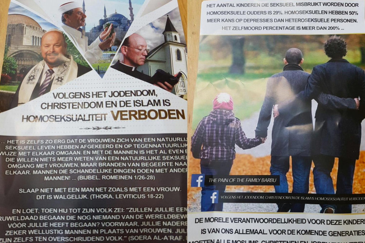 Op het pamflet stond een oproep voor gelovigen om in actie te komen tegen homoseksualiteit. 'Volgens het jodendom, christendom en de islam is homoseksualiteit verboden!', stond met grote letters op het pamflet geschreven. Dankzij camerabeelden kwam de politie de verspreiders op het spoor.