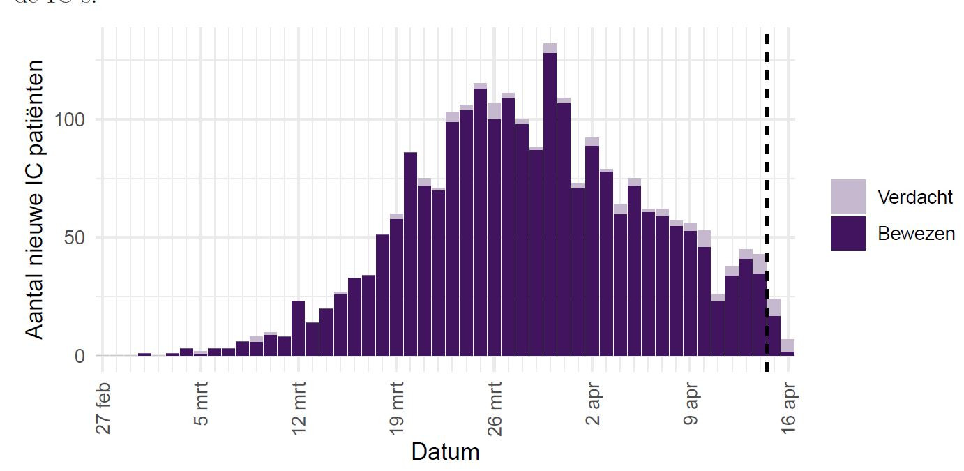 Het werkelijke aantal COVID-19 patiënten is hoger dan het aantal meldingen in de surveillance, omdat niet iedereen met mogelijke besmetting getest wordt. Het werkelijke aantal COVID-19 patiënten opgenomen in het ziekenhuis is hoger dan het aantal opgenomen patiënten gemeld in de surveillance, omdat de surveillance gebaseerd is op de informatie op het moment van melding. Ziekenhuisopname na melding is niet altijd bekend.
