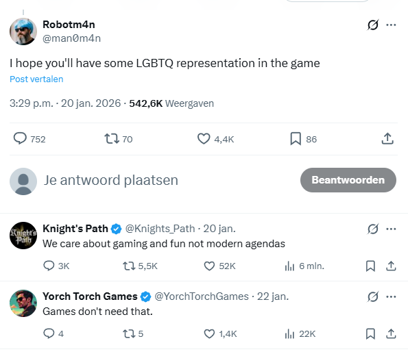 Een nieuwe indiegame, Knight's Path, ligt onder vuur vanwege beschuldigingen uitsluiting van LGBTQ-relaties. Het spel, een actie-RPG met een verhaal, speelt zich af in een Middeleeuwse wereld die is geïnspireerd op het Heilige Roomse Rijk. De eerste gameplay-trailer trok maar liefst 2,2 miljoen views op sociale media. Toch kreeg het project van ontwikkelaars Jan Tichota en Aamn Chahrour veel kritiek te verduren, zowel omdat het zou lijken op Kingdom Come: Deliverance als vanwege hun beslissing om geen LGBTQ-relaties op te nemen.