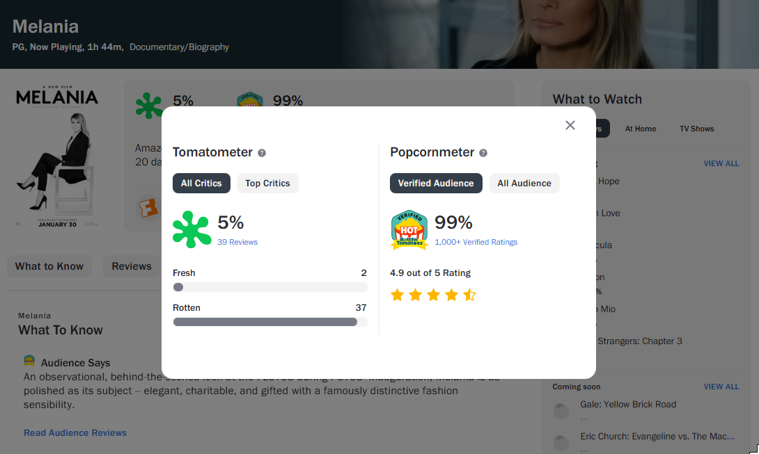 De bioscoop reageerde daarop door de tekst op het bord te veranderen in: "Amazon called. Our marquee made them mad. All Melania showings cancelled. Show your support at Whole Foods instead." Daarna volgde nog een sneer met: "Join Amazon Prime for Free Two-Day Shipping." Amazon gaf geen directe reactie op de situatie. De documentaire zelf doet het landelijk juist goed en noteert de beste cijfers voor een documentaire in tien jaar, ondanks vernietigende recensies van critici. In de eerste week versloeg de documentaire zelfs de nieuwste actiefilm van Jason Statham, Shelter.