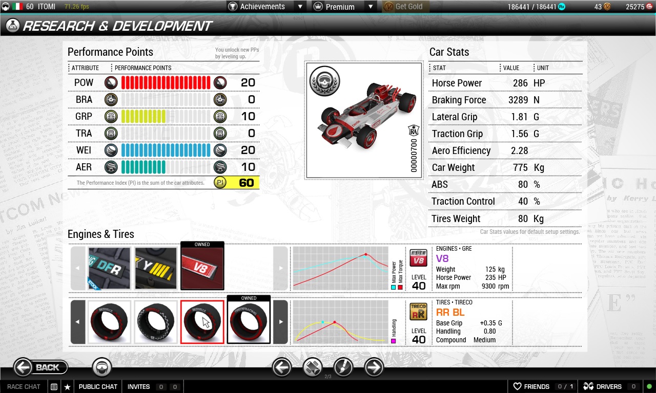 Elke auto wordt beschreven door zes attributen: gewicht, aerodynamica, grip, tractie, remmen en kracht. Door je blokken en vooral de gekochte accessoires krijg je een totaal aantal performancepunten te besteden in deze attributen. Wil je meer performancepunten, dan moet je nieuwe accessoires kopen die je meer performancepunten geven. Zo geeft een standaard motor je tien punten die je kunt verdelen over de zes attributen, maar een betere motor geeft er misschien wel vijftien. Een bijkomstigheid om rekening mee te houden: je attributen verlagen na een aantal races langzamerhand. Door je auto te onderhouden met items moet je zorgen dat je de auto niet te erg verwaarloost waardoor je minder presteert in een race.