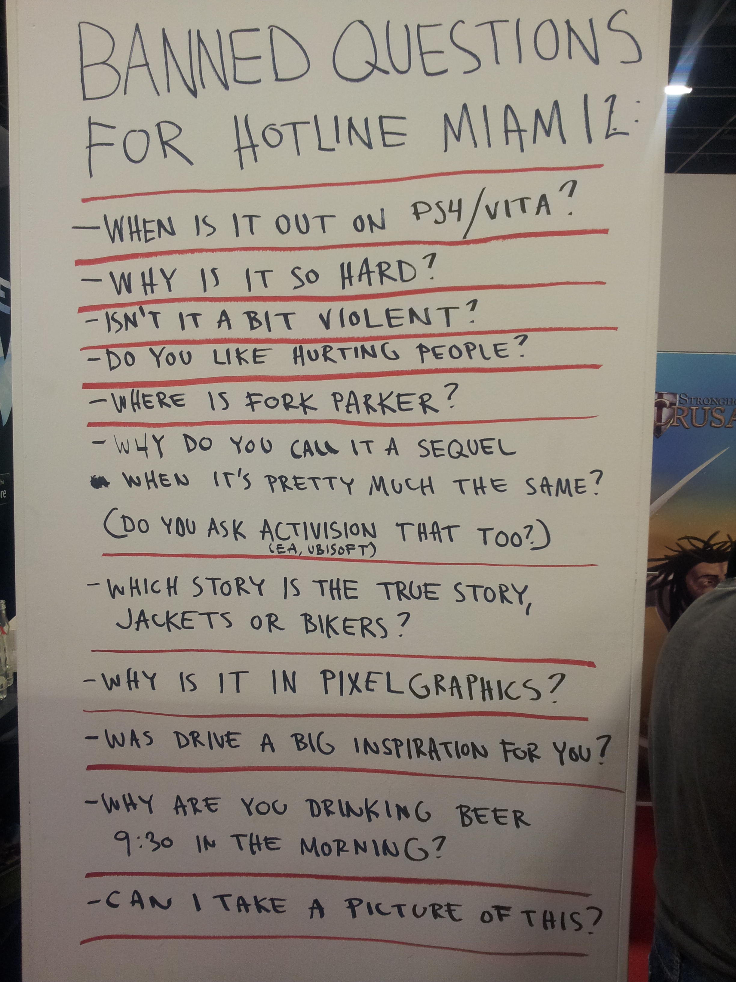 De game waar menig gamefan op wacht is dit vervolg op Hotline Miami. Iedereen die de stand van Devolver op kwam lopen tijdens GamesCom liep gelijk naar Hotline Miami 2 toe. Na een kleine kwartiertje wachten (een Duitse cameracrew vond het nodig om twee plekken in beslag te nemen) konden wij dan eindelijk aan de slag met de game. Gelijk bij de start van het spel werd één ding duidelijk: het spel is beduidend lastiger geworden. Waar je bij het eerste deel enkele levels kon halen door alleen maar je handen te gebruiken, had ik nu vaak al moeite om de eerste vijand neer te maaien. Ik had maar twee maskers en geen enkele bood mij een wapen. Voordat ik de eerste vijand neer had gehaald, was ik alweer dood geschoten door een tweede vijand. De frustratie begon weer te borrelen maar na enkele keren proberen lukte het dan eindelijk.