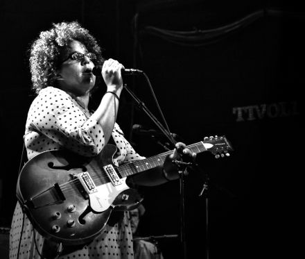 Rond 21.30 betrad het quintet de planken van Tivoli. Het lijkt een gemêleerd gezelschap, maar de podiumopstelling zorgt voor een cirkeltje waarin de band als passend geheel overkomt. Frontvrouw Brittany Howard stapt in haar bolletjesjurk en gekrulde coupe naar voren, kijkt even vlug over haar bril het publiek in en zet meteen 'Hold On' in. De fijne Southern bluesklanken glijden voorbij. Howard kan even inkomen, maar lijkt dat niet nodig te hebben en zet aan het eind van het nummer haar karakteristieke volle uithalen in. Het yeehaw-geluid wordt verder opgevoerd met 'Hang Loose', en vervolgens komen 'I Found You' en 'Rise to the Sun' voorbij. De band presenteerde hiermee ook meteen het eerste deel van hun debuutplaat Boys & Girls. Je kon dan al niet anders dan diep onder de indruk zijn van de vocalen van Howard. Wat een scheur en bereik heeft die vrouw! Bijna achteloos gooit ze haar hoge noten en rollende oerschreeuwen eruit en rammelt tegelijkertijd nog eens losjes op haar gitaar. Ondanks haar topprestatie lijkt ze wat onder de indruk en verlegen te zijn. Pas na het vijfde nummer richt ze zich tot het publiek: "It took me this long to gather up enough courage to talk to you", zegt ze vluchtig. Ook de rest van de band heeft het oogcontact en interactie met de zaal niet uitgevonden. De bassist tuurt soms even richting de mensenmassa, maar voelt zich toch prettiger opgaand in de muziek en trekt hierbij de mooiste grimassen. Na de paar woorden van Howard dendert de Alabama Shakes-trein voort. 'Heartbreaker' wordt in lange versie met verve uitgevoerd. Howard gaat helemaal los en toont haar hart en ziel op veel van haar nummers, alsof ze een monoloog tegen degene voert waarover elk lied gaat. Haar uithalen worden rauwer en feller, en haar bril zakt steeds verder naar het puntje van haar neus.