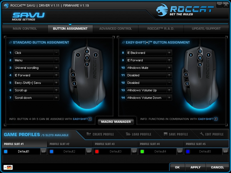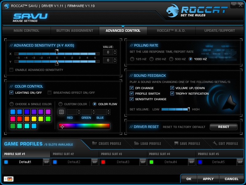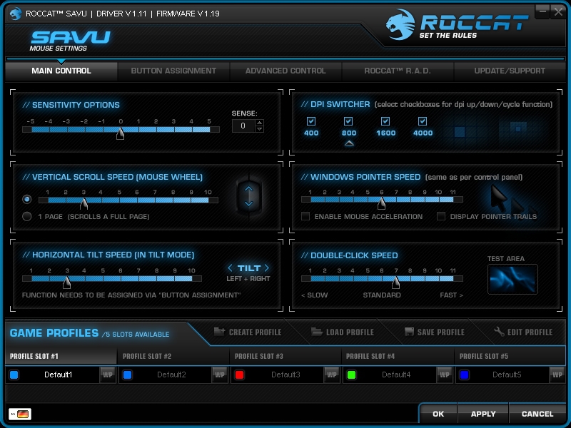 De Roccat Savu is een optische muis. Muizen met lasersensor zijn schering en inslag, maar Roccat is met deze muis de optische kant opgegaan. Dit heeft als voordeel dat je op glasplaten en dergelijke minder problemen zult ondervinden. De Savu heeft een optische sensor die tot 4000dpi gevoelig is. Tot, want de Pro Optic R3 sensor is instelbaar in stappen 400, 800, 1600 en 4000. De gevoeligheid is van te voren in te stellen, dus niet tijdens het gamen zelf. Echt nodig is het niet, want met de bijbehorende muissoftware is het mogelijk verschillende profielen aan te maken. Zo kun je je favoriete instellingen per game vastleggen. Deze worden automatisch geladen als je het spel start. Snelheid van muisaanwijzer, scrollwielsnelheid, dubbelkliksnelheid en meer is instelbaar. En reageren doet deze muis dan ook prima.