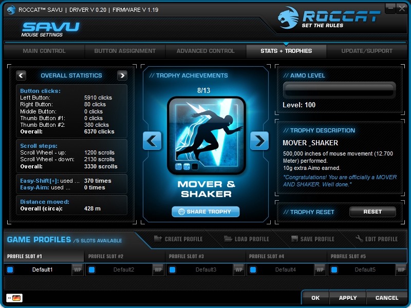 Het meest bizarre aan de software is het Roccat Achievement Display. Dit R.A.D. is een achievement-voortgangscherm. Ja, je leest het goed, er zijn achievements te behalen door de muis te gebruiken. Een x aantal klikken met rechts, zoveel kilometer afgelegd of zoveel met het wieltje gescrolled, er is van alles. Er zijn er op dit moment dertien verschillend met daarin gradaties. Voor de echte achievementhoeren een leuke feature, voor de statistiekenmensen leuk om te zien hoeveel klikken je hebt gedaan, maar echt heel noodzakelijk: nee. Leuk bedacht, dat wel. In zijn geheel is de software logisch ingedeeld, is eenvoudig te begrijpen zonder een handleiding en is best uitgebreid te noemen.