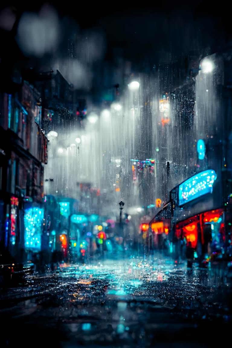 prompt: rainy city street scene, night, lit up by neon signs, bokeh, black and white and isolated pops of neon blue laser rain, strong light, strong contrast