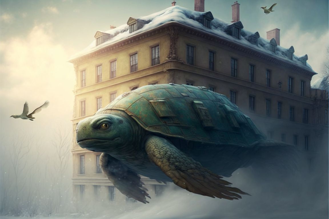 prompt: [Model: MidJourney] blue steam turtle 5 carrying the old apartment building on his back, the old apartment building is covered in ice , brown steam turtle flying above the clouds , sunny day, depth of field, dreamy atmosphere, in style of Studio Ghibli, Howl's Moving Castle, environmental concept art, hd