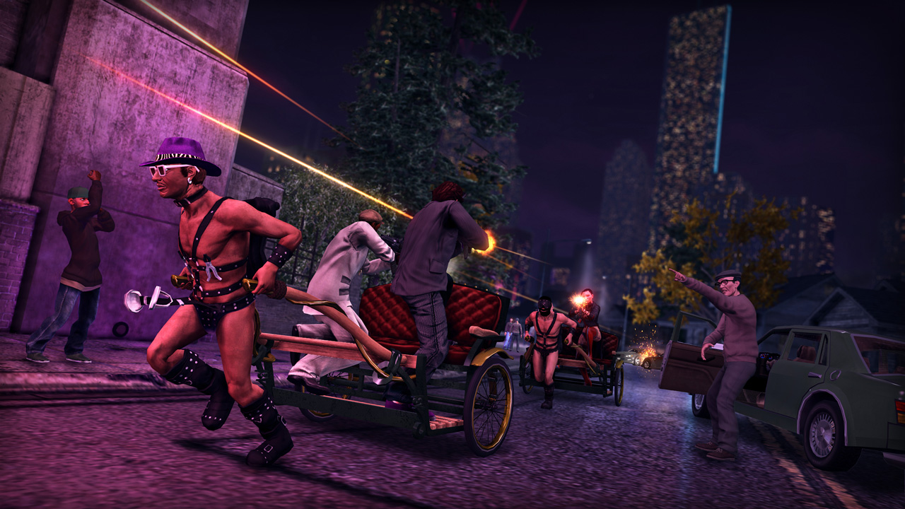 Al vanaf het begin blijkt dat Volition en THQ geen woord gelogen hebben over alle gemaakte beloftes. Het verhaal begint met 3rd Street Saints, voorzien van gigantische Johnny Gat-maskers, die met behulp van een helikopter een complete bankkluis proberen te stelen, hetgeen overigens niet lukt. Vanaf dat punt gaat de absurditeit in zowel de storyline als de open wereld met rasse schreden omhoog. In elk deel van de stad, die weer door een andere gang wordt bestuurd, zie je de belachelijkheid letterlijk op straat lopen. Vrouwen in bikini, mannen in sm-pakjes, gemaskerde worstelaars, alles loopt langs je heen. Ook in de wapens zit een progressieve rariteit. Gigantische handen, computers om airstrikes om mensen af te sturen, high-tech zwevende vliegtuigen met lasers, een menselijk kanon, alles kan blijkbaar. Toch winnen zij het geen van allen bij mijn favoriete wapen, de dildobat. Niets mooier dan door de stad lopen en mensen doodslaan met een manshoge dildo met een handvat.