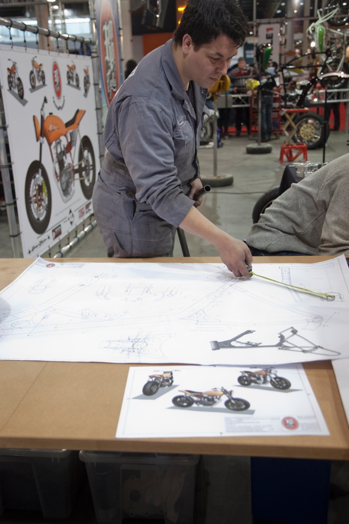 En wil je liever met eigen ogen zien hoe zo'n custom bike nou wordt gemaakt? Dat kan ook! In het Men at Work paviljoen wordt door vier partijen - met elk hun eigen functie en specialiteit - in 4 dagen tijd een complete motor gebouwd.