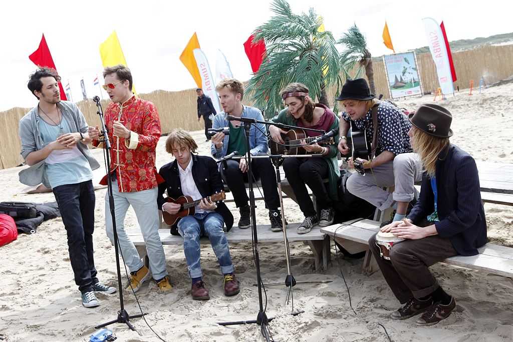 Jamsessie op het strand van Handsome Poets en Will and the People.