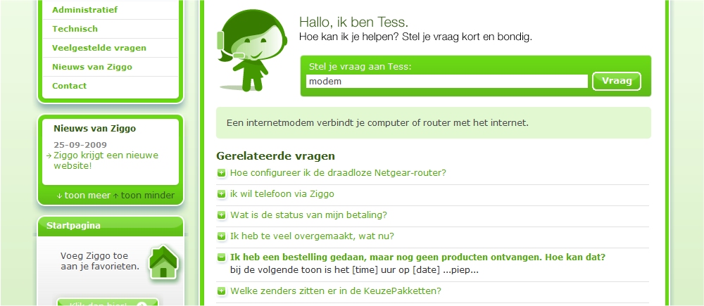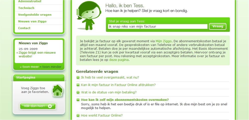 Ziggo heeft een dame genaamd Tess aangenomen om de domme vragen van de klanten te beantwoorden. Gevalletje PMS? Of gewoon een ontslagen werknemer die de content even heeft aangepast? Jij mag het zeggen.